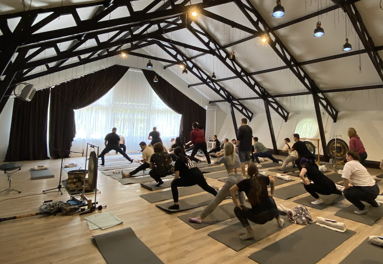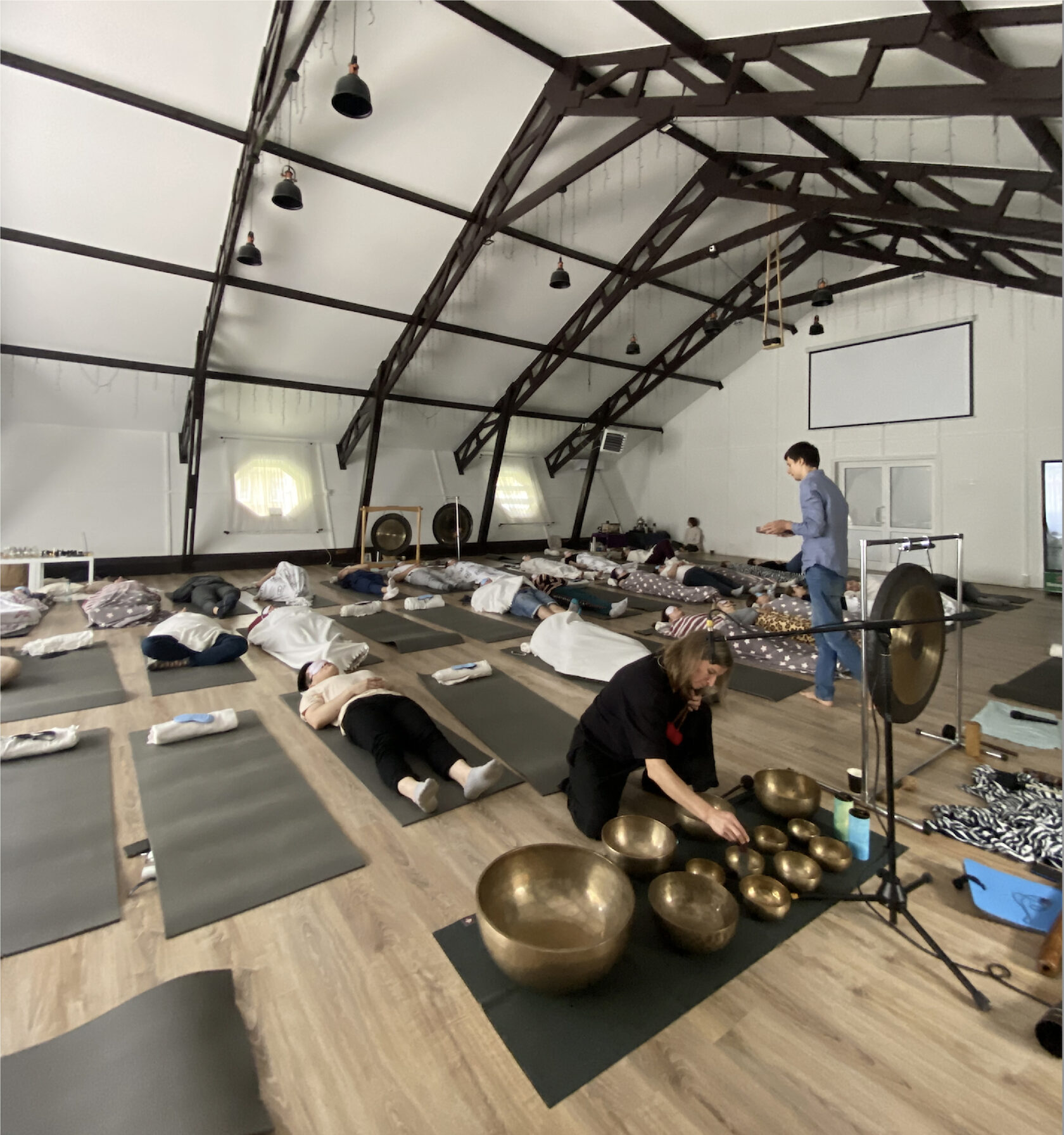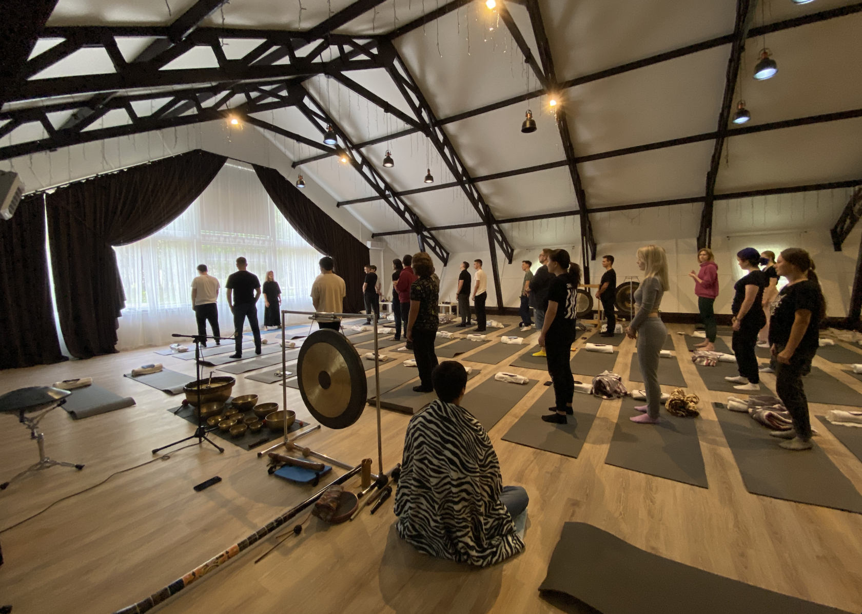 Начали день энергично с утренней зарядки и практики йоги. Далее погрузились в глубокую практика релаксации и расслабления, переходящую в звуковую медитацию с использованием тибетских чаш, гонгов и других музыкальных инструментов.